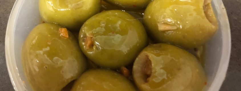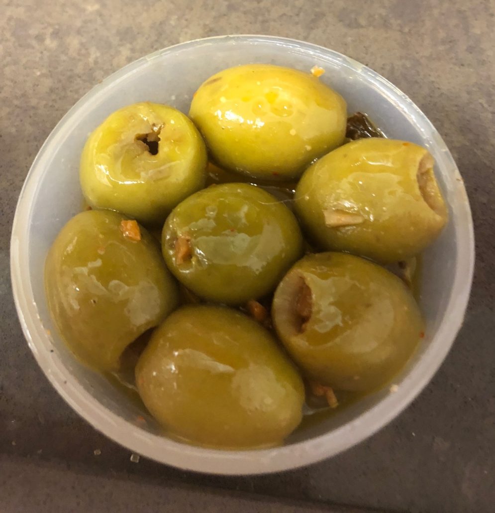 Now’s the fun part. Open your spice cabinet and find an interesting combo spice (I love Tuscan from Pereg, or smokey mesquite of Weber, or smoked paprika and tumeric etc.) or combine your own. The idea is to find a smokey type of spice and you can add chopped onion or garlic and parsley if you wish. Whatever tickles your fancy. Just don’t add salt since the olives are full of it. Stir spice well into olive oil. Shake the drained green olives into the mixture. Snap the container closed and make sure it’s well sealed since you’re about to shake it all about.
