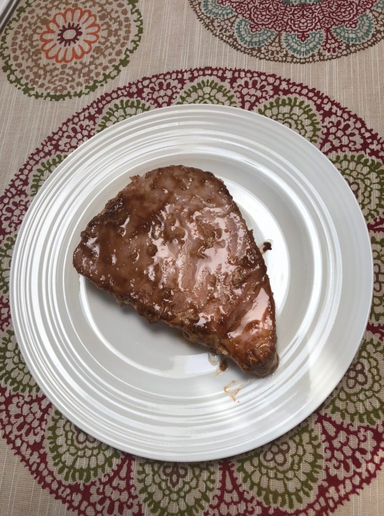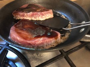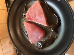 Take your nonstick pan and heat till hot (but not smoking).  Coat the top of the tuna with the sauce, flip and place on hot pan sauce side down (do not grease pan).  Watch the tuna like a hawk, you will see (it’s actually really cool) the cooking tuna have white rising up from the bottom of the pan.