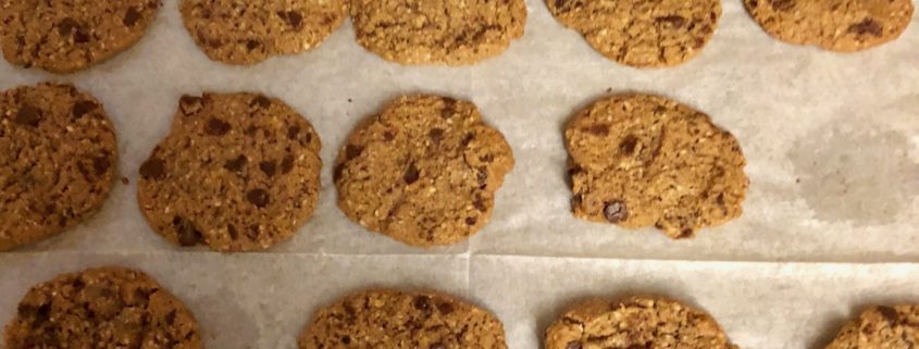 Preheat oven to 375 degrees. Cream margarine and sugars together till fluffy. Add eggs and vanilla, mix till incorporated. Put aside. Take out your food processor with the steel blade. Put in the oatmeal, flour, salt baking soda and powder and the nuts and 100 gram chocolate bar, broken up into chunks. Mind you I have a big food processor so all this will fit with no problem. Pulse it all together till it turns mealy and the chocolate bar turns into tiny slivers in the mixture. Add the floury mixture to the margarine mixture and beat together in your mixer till incorporated. Then add the chocolate chips and mix just a few more seconds. Now, you can make the whole mixture at one go and it’s a LOT of cookies, more than 4 dozen, or you can do as I suggest above and make part of the recipe and roll logs of cookie dough in parchment paper and freeze (only let defrost after slicing briefly before baking). I freeze briefly even the amount I’m gonna bake because then you can slice rounds, lay on cookie sheet and bake. Easier! However, if you wish you can roll into walnut size balls or use 2 teaspoons and drop, as you please. Okay, here comes your personal preference part. If you bake for 8 minutes, more chewy, if you bake for 9, crispy with a hint of chewy, 10 minutes, crispy. You’re the boss! Go ahead, revenge is yours 😛