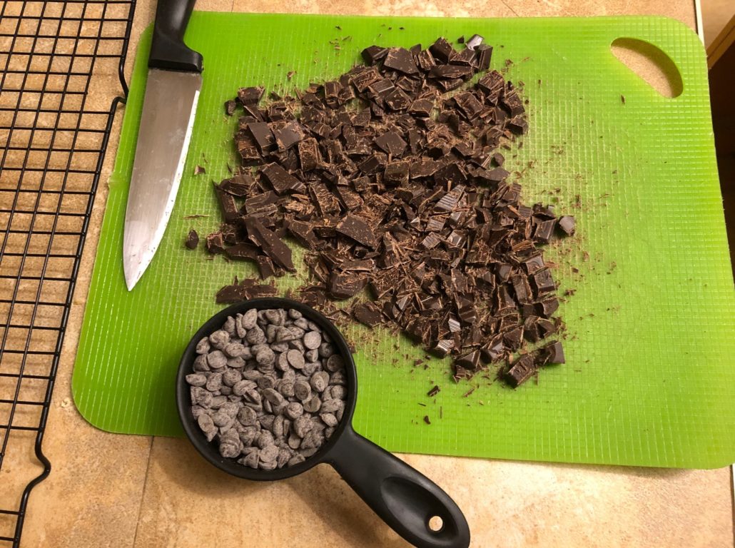 2 cups (350 grams) chopped chocolate or chocolate chips or a combination thereof which is what I did, see above pic