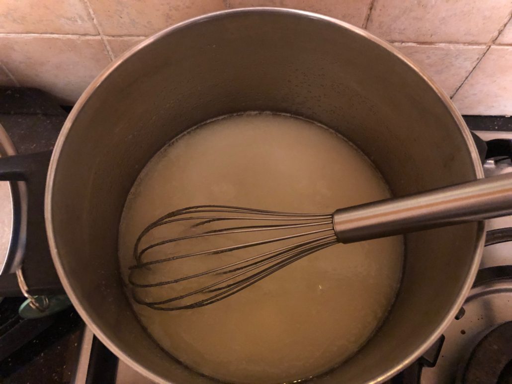 Then, I changed this part, they wanted you to add chocolate chips while the mixture was still on the fire. Don’t, you might overcook or burn the chocolate. Take off the heat but immediately add the chocolate. The residual heat is still very strong and your chocolate will melt but not burn. I also wanted better tasting chocolate than just chips, so I added good quality chocolate which I chopped. It improves the flavor enormously.