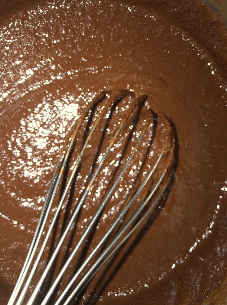 In a small pot (with high enough side, therefore not a pan), put the butter/marg and on low heat start to melt and add sugar to this, and the water. Stir together over the heat till the sugar melts. Remove from heat, add vanilla and chocolate and stir till chocolate completely melts. Add flour next and stir well till incorporated and lastly add the eggs (I add eggs last so they shouldn’t curdle from the heat) stirring till smooth.