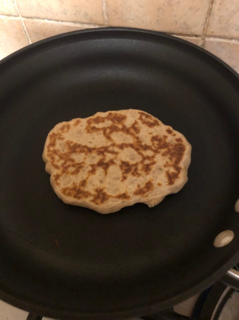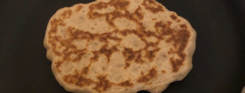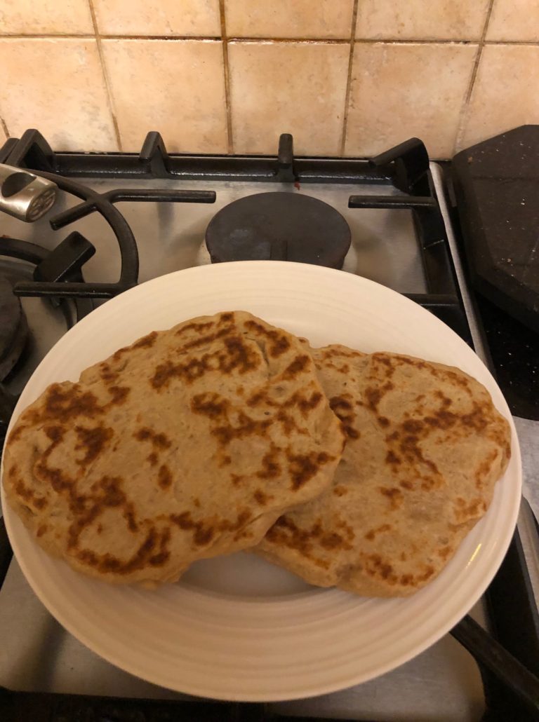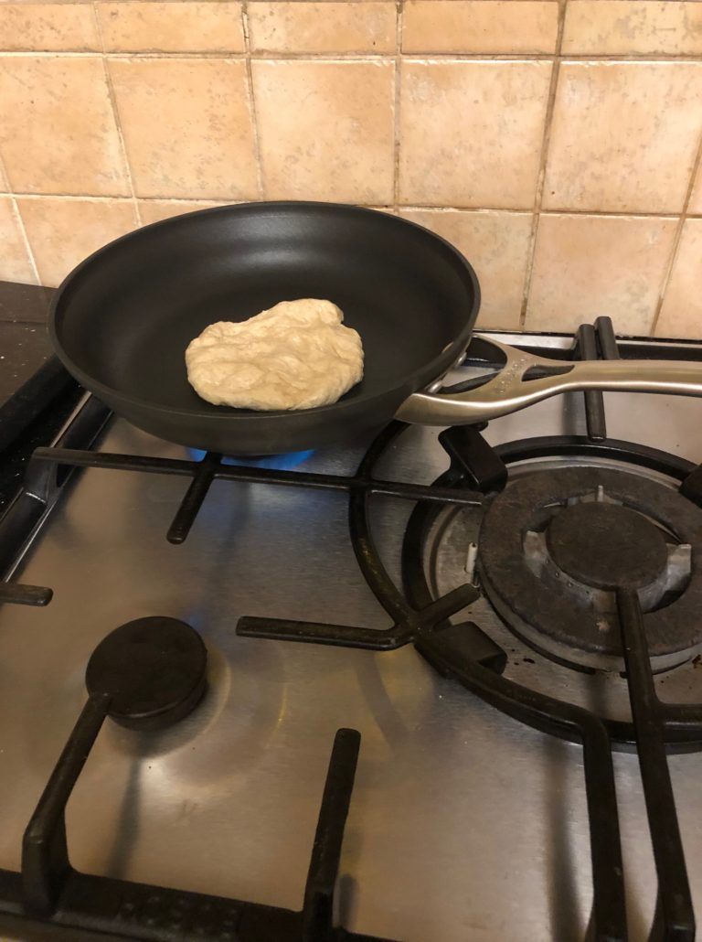 Note how it puffs up in the pan. Unlike pancakes, it’s bumpy, that’s as it should be. I found it needed 2-3 minutes of cooking on each side to be thoroughly cooked. I used no oil in the pan, neither plain oil or spray oil. You don’t need it. The dough hisses as it hits the hot pan, and again when you flip it over to the other side. You are not frying it, you are pan cooking it. In fact, the only oil in this recipe is when you coat the dough before leaving it to rise. I also sprayed my hands with oil spray to form the balls more easily without sticking to me.