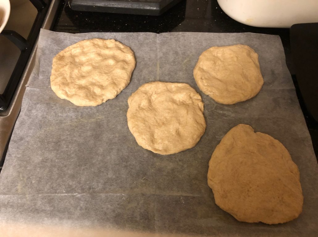 They looked sort of like fat pitas but are made with yogurt mixed with water and are a yeast bread. Since I wanted it to be close to the original recipe, this was to be a go with for a dairy meal. This is normally made with white flour but I cheated and used whole wheat pastry flour. I know, I know, less authentic, but…