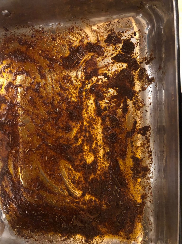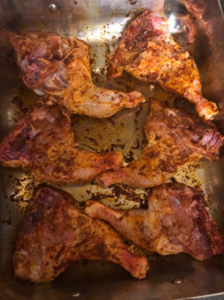 Don’t be put off by this, simply place the chicken skin down in the pan, rub it in the oil/spice mix till coated and rub the additional mix on the underside of the chicken. Make sure your chicken is skin side down for the roasting.
