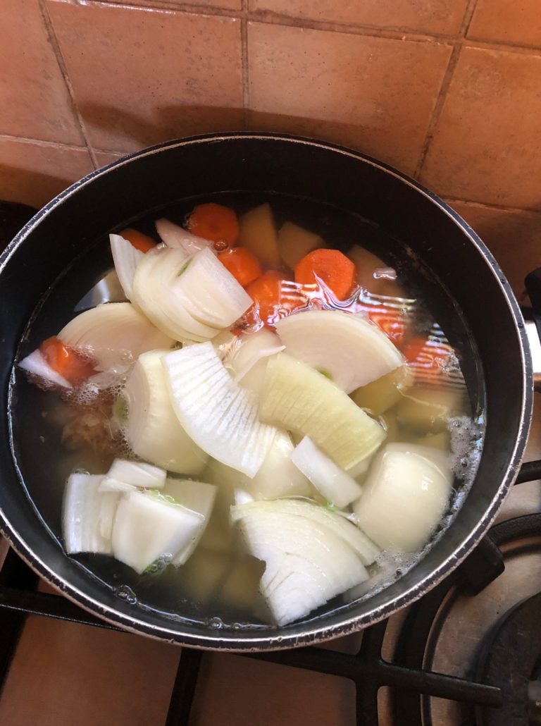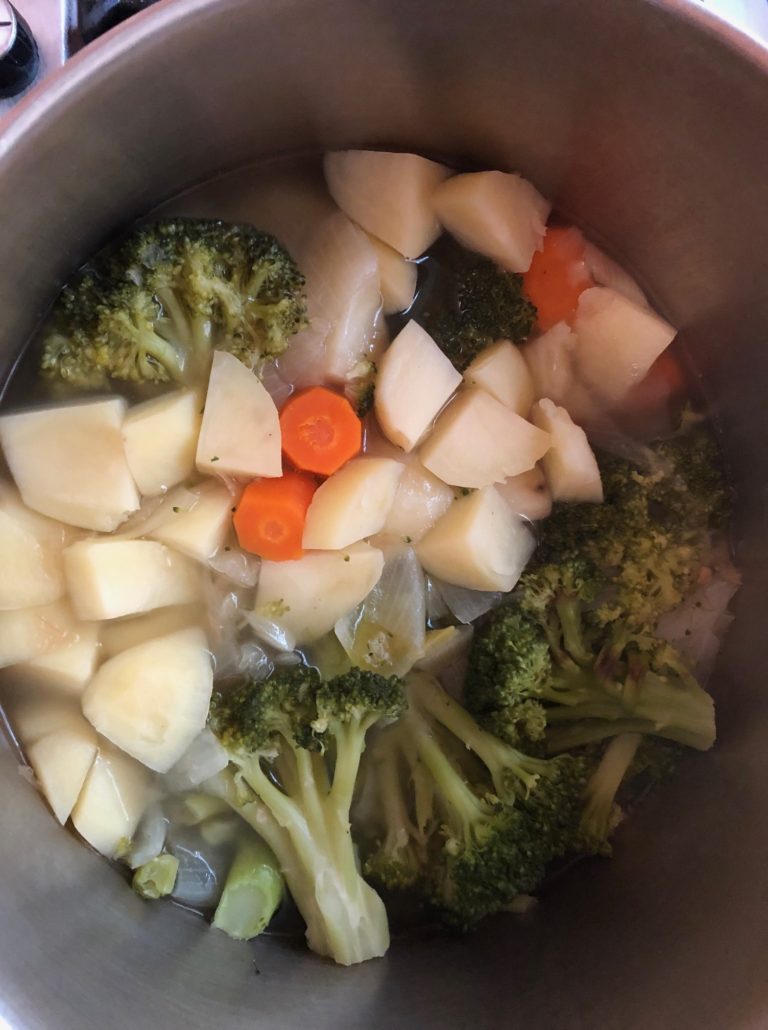 Steam broccoli in microwave (or stovetop) for 5 minutes. Set aside. Take a nice big pot to hold all ingredients. Put in 3 tablespoons of oil. Heat, add half of chopped onion and cook till medium yellow, do not allow to get dark brown or it will get a bitter flavor. Then, add rest of onion, carrot, garlic and potatoes. Add tablespoon of the salt, 2 tablespoons of the soup mix (you will taste and see if you need to add more at the end of the cooking), nutmeg and garlic powder. You are doubling the garlic flavor since I prefer not to brown garlic in oil when it’s crushed since it so easily acquires a bitter taste. Cover with water till an inch or two to cover all the veggies.