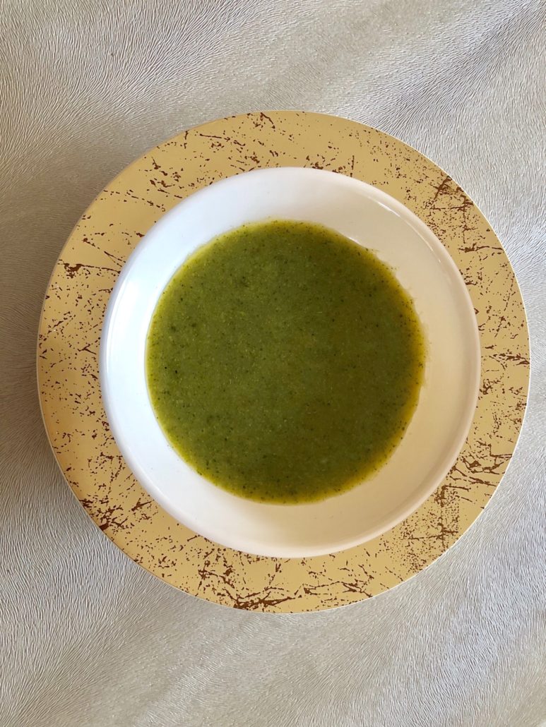 Note the gorgeous green color. The consistency is medium thick. If you wish it to be thicker, you can add another potato or two at the beginning of the soup making process but this is just right. Not too thin, not too heavy.