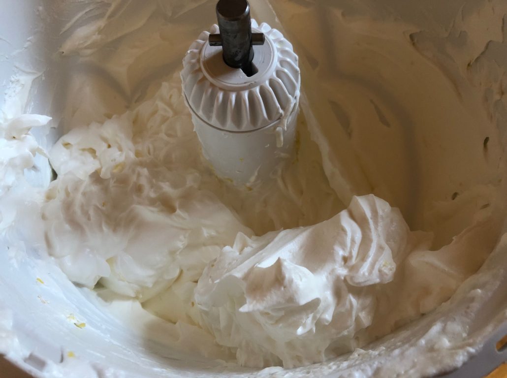 You separate 4 eggs (not much all considered) and whip the whites and yolks separately with sugar till both are fluffy, separately whip the Rich’s Whip or heavy cream (I prefer the Rich’s since it’s lighter), stir in the lemon or orange peel and juice and gently fold the whole thing together.