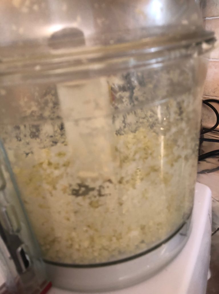 And I processed it in careful bursts, not on the ON button but rather the pulse button. This is really important or you might end up with a mushy puree and too bad. So, be patient and pulse, pulse, pulse, checking carefully to be certain it’s not being overprocessed.