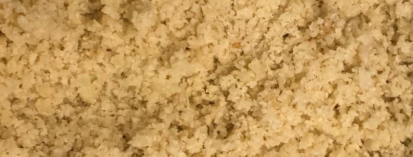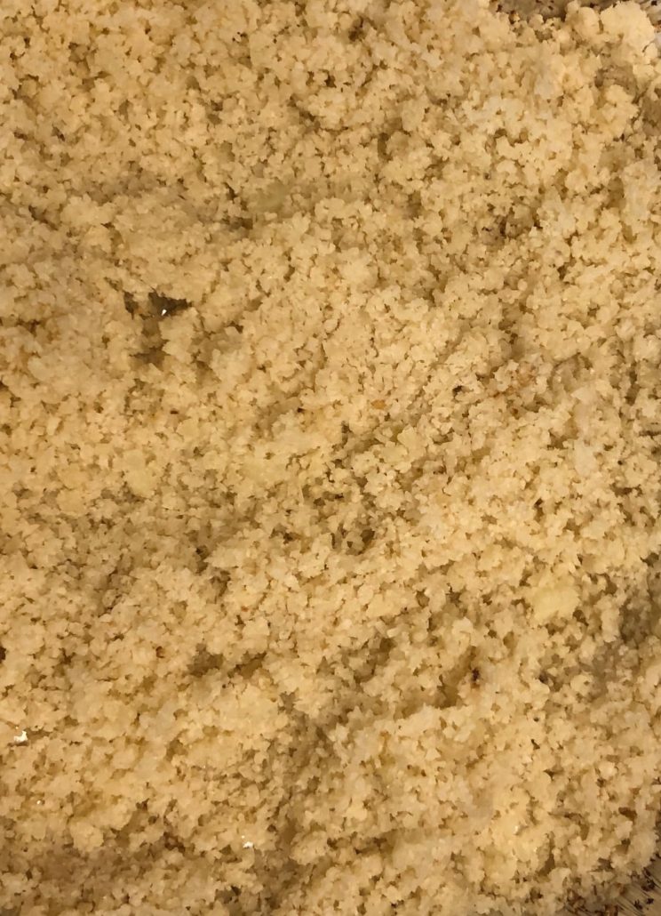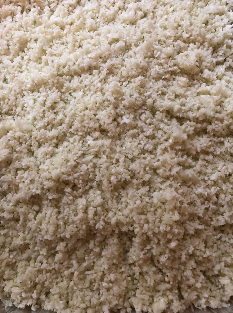 Take out your food processor, sorry but nothing else will do, not even a blender, I’m afraid. Put one third of the cauliflower flowerettes into the processor and carefully on the pulse button, NOT the ON button, pulse the cauliflower, a few seconds at a time and peek at it, till the cauliflower resembles couscous. Scrape it out into a baking pan and do the next third patiently and scrape out and so on till you’ve done the whole lot and it’s in the baking pan. If you do the whole amount at one go, you will wind up with a puree and some big chunks and it’s a shame to waste your beautiful cauliflower that way. So, this time patience truly is a virtue 🙂 .