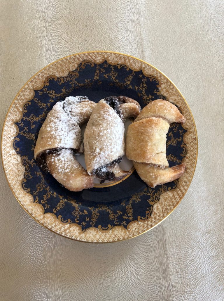 Put the rugelach into the hot oven for 20-25 minutes, checking after 20 minutes or till medium brown. Don’t let them get too dark a brown since it will make them brittle.