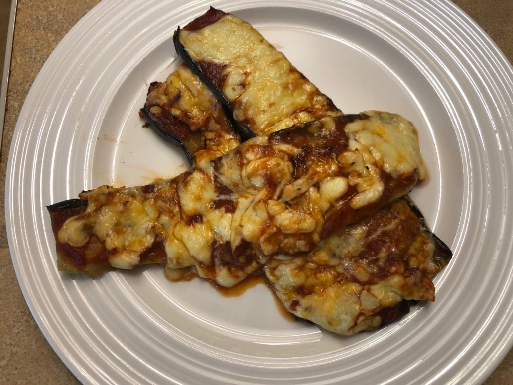 Fit them into an oiled or oil sprayed pan and either brush with oil (olive is good or canola is fine too) or oil spray them on both sides. Put in a hot 425 degree oven for approximately 10 minutes, check to make sure it’s light brown (not darker, you don’t want it bitter) and flip to other side and cook about another 10 minutes till other side is light brown as well. The second side may cook more quickly so keep an eye on it. You want the eggplant to be soft but not totally mushy. You can check it with a toothpick, it should go through easily.