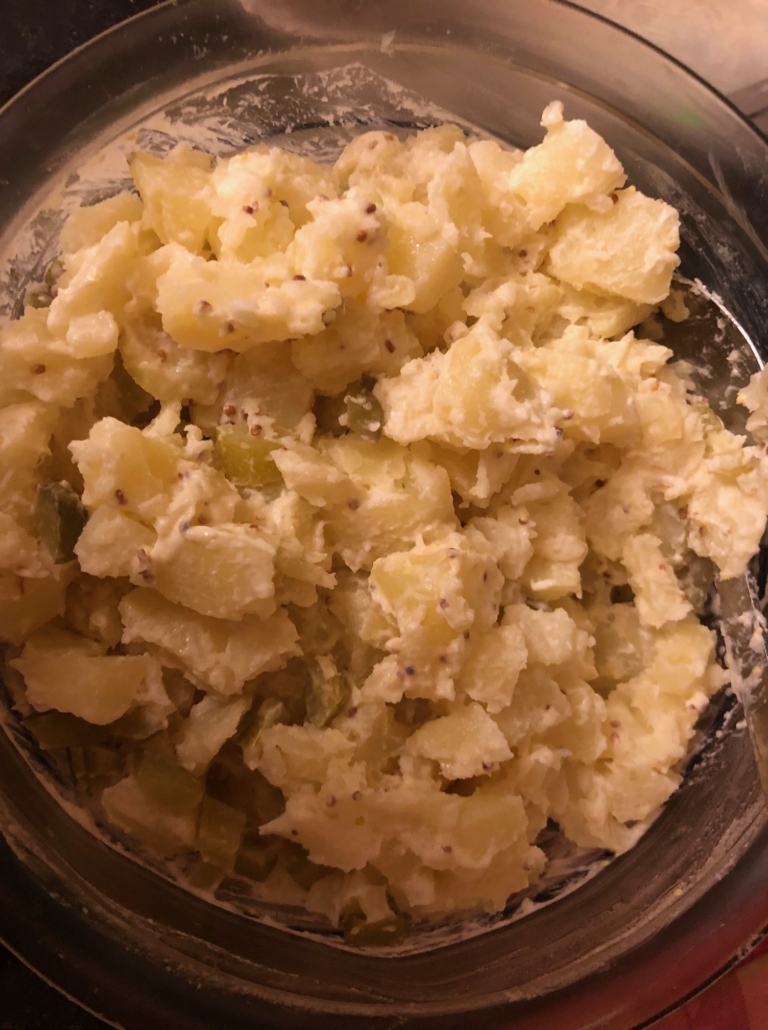 Take a cutting board and cut potatoes into smallish cubes (not tiny but also not too big, a nice mouth sized bite) and set aside. In the bowl, mix together the mayo, chopped onion, three chopped pickles in brine (I prefer to vinegar) a heaping tablespoon of wholegrain mustard and approximately 2 tablespoons of reserved pickle juice. Whisk all together till a creamy dressing forms.