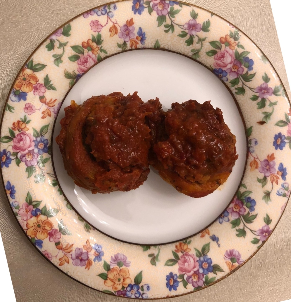 If you haven’t got frozen fried onion (I will post how to do that in the near future) take the chopped onion and fry in the 2 tablespoons olive oil. Mix into the chopped meat with the oil and add garlic, , breadcrumbs, egg and chopped parsley together into a smooth mixture. Pack evenly into the drained bottoms. Set aside.