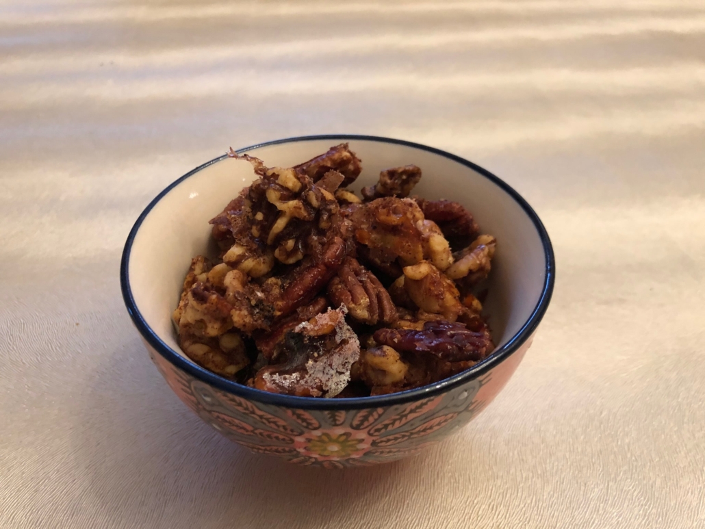 You can put the whole thing together in about 20 minutes including prepping, and the ingredients should be readily to hand. Since I find walnuts have a hint of bitterness, I actually like them mixed with the sweeter pecans since they play against each other in taste. If you want more bitter, use all walnuts, more sweet, all pecans. As you wish. There is no egg white in this, the oil and honey are what “wet” the ingredients so the spices stick to them.