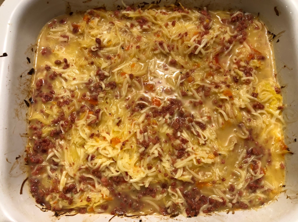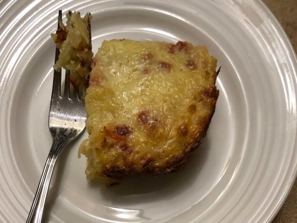 Hash browns are simply shredded potatoes. You are “sauteing” the hash browns, onion and peppers right in the baking pan in the oven in butter and oil before adding the rest of the ingredients, saving you from needing to cook on the stovetop. A word of warning, it will get a bit crispy but if you want the bottom more crispy you will need to add a lot more butter/oil which I choose not to do.