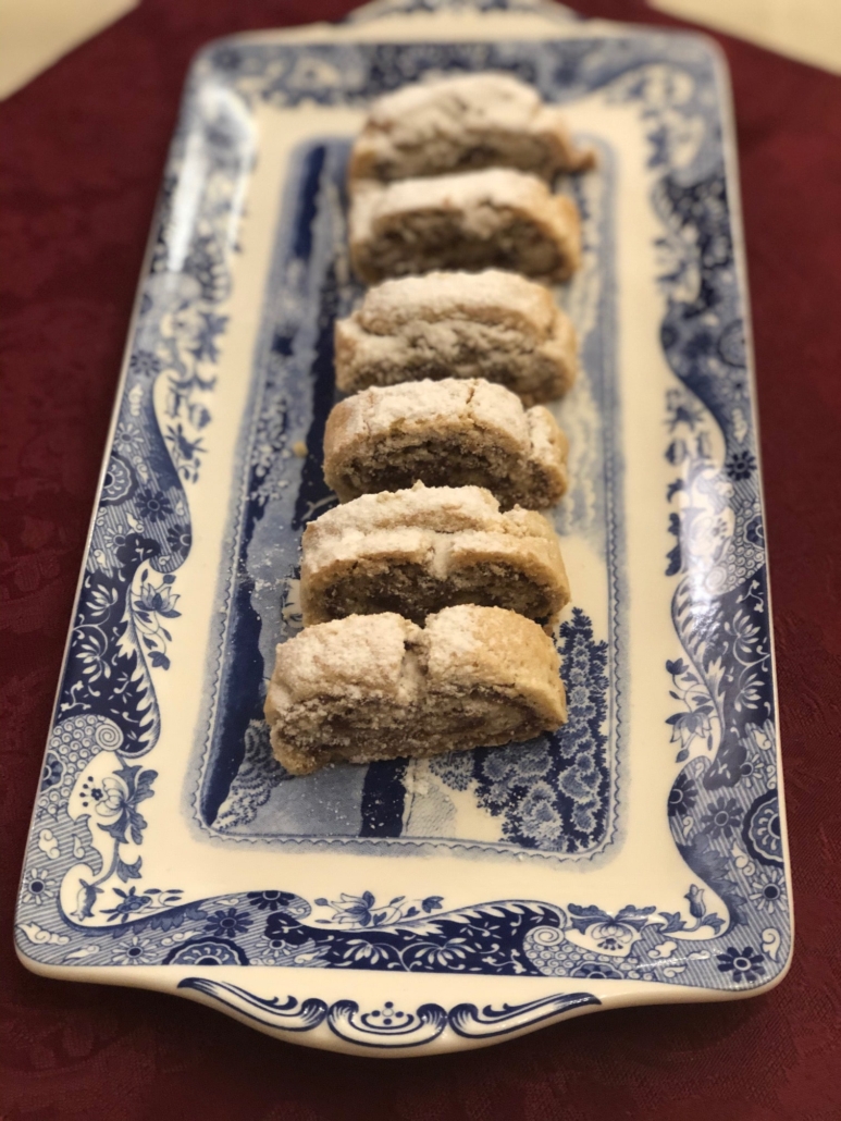 Cut each log halfway down- don’t cut all the way through! – at intervals to prepare the pastries (see pic above). Bake 350 F for 30 -40 minutes till lightly browned and remove and cool on wire racks. When fully cooled, sprinkle generously with powdered sugar and cut through all the way and your pastries are ready.