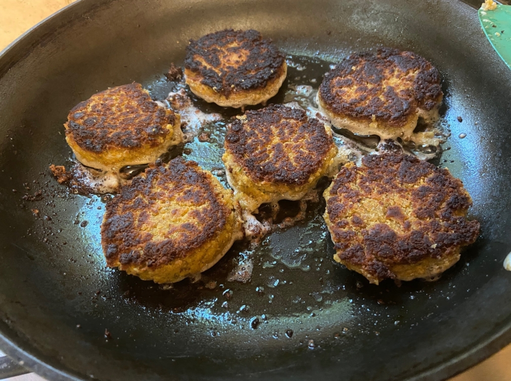 Heat the oil in a frying pan and take an ice cream scooper or two tablespoons (or oil your hands and prepare) and make patties with the mixture. Put in the hot oil carefully (which you lower to medium heat) and fry for about 4 minutes on each side, checking to make sure they don’t burn. Add additional oil between batches, letting heat up again before putting next batch in.
