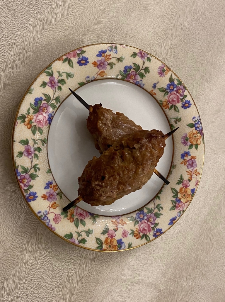 So now, I often do it even when breadcrumbs are available to me to use. You get a completely different texture that I really enjoy. I love to serve them on a small skewer both for presentation and cooking ease. The first thing you have to do is soak the wooden skewers in water so that they won’t burn, at least 20 minutes.