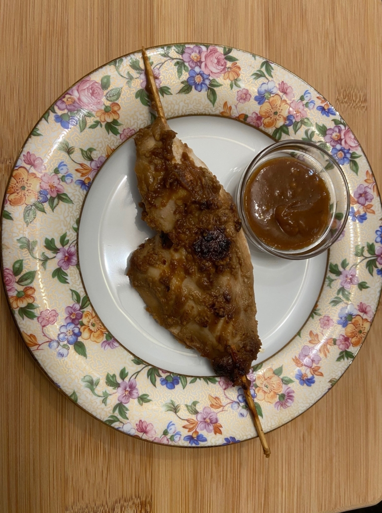 I had an overabundance of shnitzelized chicken and wanted to try chicken satay, which is a skewered chicken and decided to skewer it not in chunks but rather as a shnitzel.