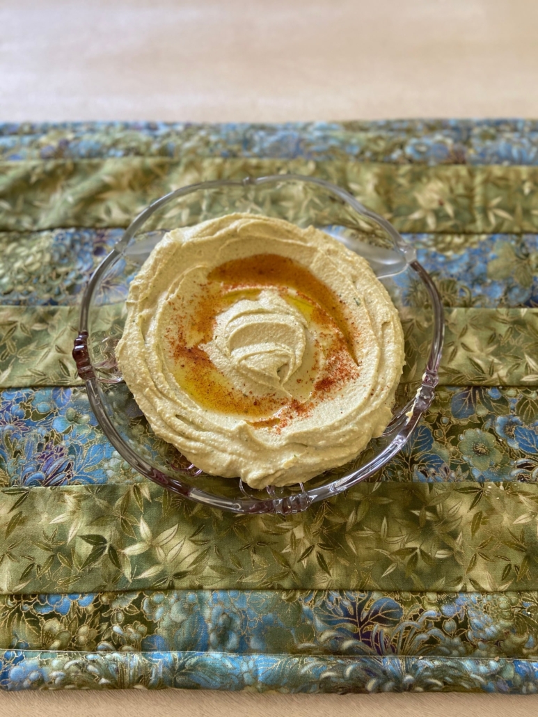 Pulse the blender/processor a few times and then whirl till a smooth paste is formed. You don’t want it too liquidy, it’s meant to be thick and easily scooped up with your cut up veggies or pita, crackers or challah. If you need a bit more liquid, test taste for both saltiness and consistency and see if you need a bit more lemoniness or saltiness or chickpea liquid. Don’t overdo the salt, the chickpea liquid has some in it. This will firm up a bit more when placed in the fridge. Best served at room temperature.