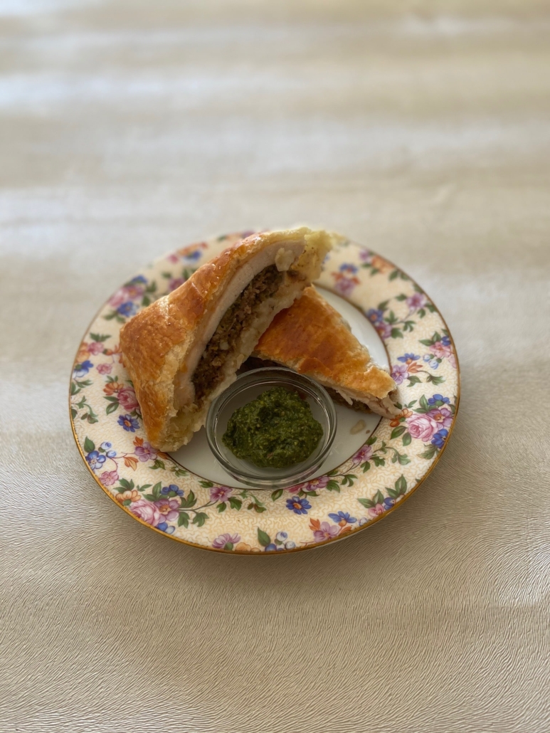 The ingredients are not fancy but the ultimate result both looks and tastes fancy, if you get me. I used mallawach dough for this this time but have used puff pastry as well and both work beautifully and they bake in the oven for about the same amount of time. You are preparing the pesto, and then you prepare the chopped meat mixture, gently roll out your dough and enfold them all together. It’s not difficult but there are a few steps to it. This is worth the end results and will be a compliment to the recipients of your work.