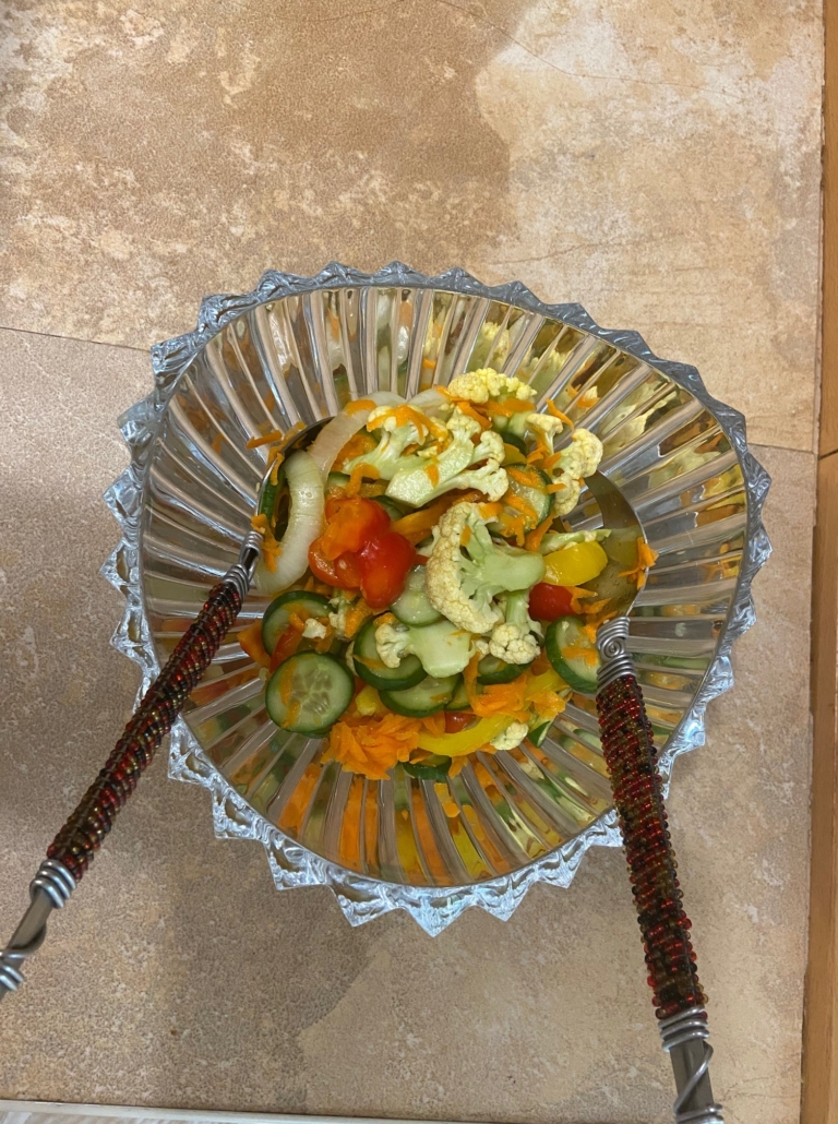 This is a bright, fresh salad with a tang and a bit of sweet to it. It was instantly loved by DH and my mom and is becoming a regular dish at our table since is is basically a pickle of all the ingredients together. It’s also pretty with a variety of colors, what could be bad?