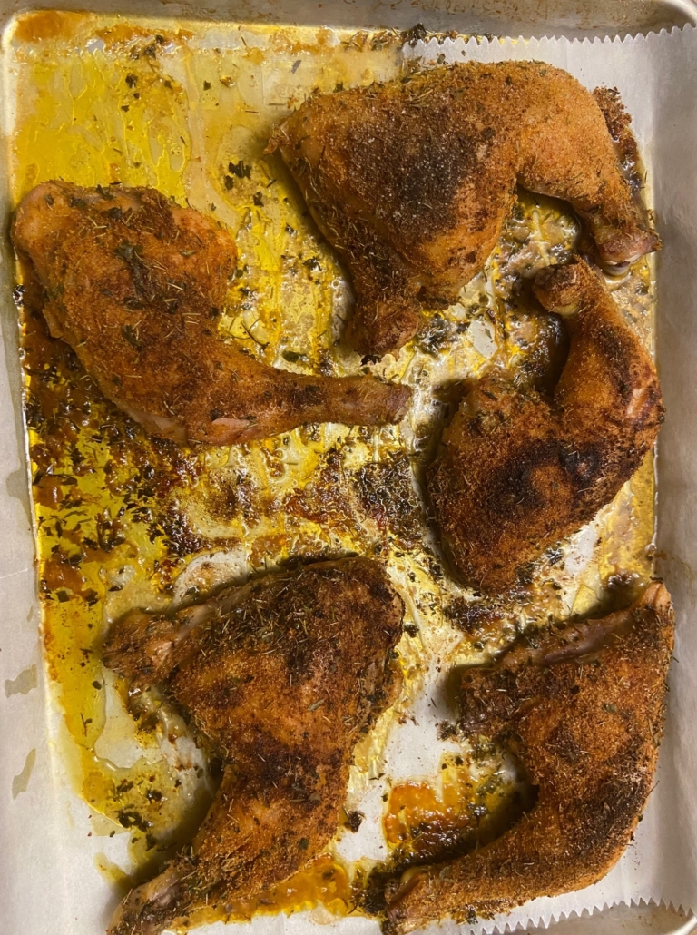Take your cleaned and patted dry chicken (I used chicken drumsticks and thighs attached) and place on a rimmed baking sheet with parchment paper. Spray chicken lightly with oil spray on both sides (or use oil). Take the rub in your hands (you can use gloves for this if you wish) and rub the spice mixture all over the chicken, on the bottom and top, leaving skin side up.