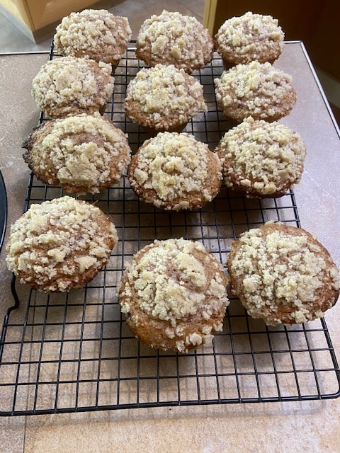 Prepare your muffin pan by oil spraying well and the top of the pan to make removal easier. Now combine the wet ingredients with the dry, scraping from the bottom, just until incorporated. Don’t over mix or the muffins get tough. Evenly scoop the batter into a muffin tin. You should have enough batter for four to five more muffins, which you can use standing muffin cups for or muffin tins. Evenly sprinkle your streusel topping over all the muffins.