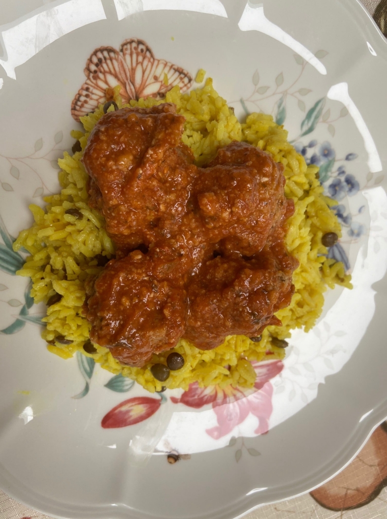 Form balls out of 2 tablespoons mixture and place on some tin foil next to your pot. Take the jarred tomato sauce (about 3 cups in the jar) and add hot water to the sauce, bringing to the simmer. Gently drop the meatballs into the sauce and cook for 25-30 minutes. Serve hot over cooked rice or spaghetti.