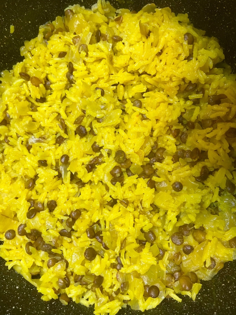 Take your rice and clean and drain very well. Add to the browned onions and add the cumin, the turmeric and the salt and add the lentils and stir to warm briefly and to coat with the oil.