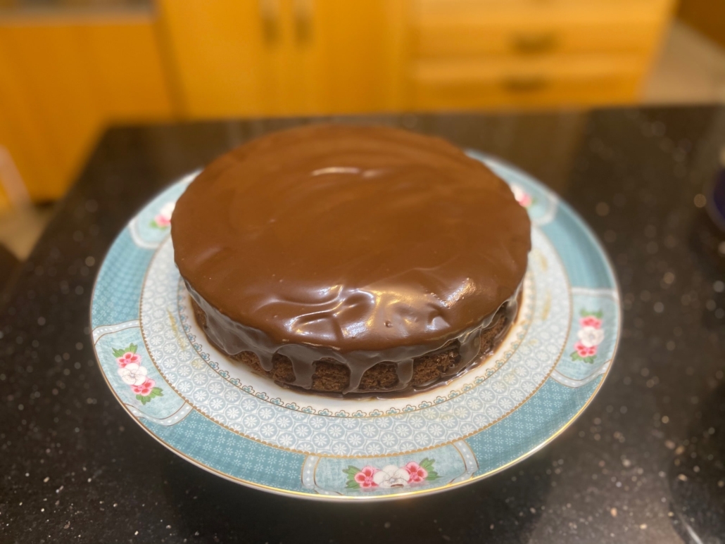 Back to our ganache topping while the cakes cool (which should be a bit faster than usual since they are thin layers). Check if the ganache is thick but spreadable since we want a bit of drip all about the cake. If not, pop into the fridge for around 10-15 minutes which should do the trick and anyway you may not, no no no, frost the cake while hot or warm. It will make the frosting run and half absorb into the cake, not a thing to be desired.