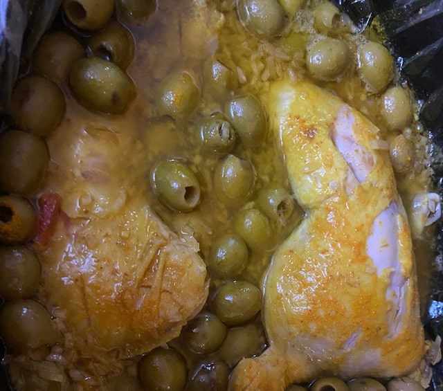 Take the whole can of pitted green olives which you have drained the liquid from, add pour very hot water right into the can (carefully!) and using a glove, pour out the liquid and do it one more time. Taste an olive to see if it’s still very salty. You may wish to do it once more. Now for both ways of cooking, add the olives. Cook in frying pan another 1/2 an hour or till chicken is super soft. Cook in crockpot an additional hour till super soft. Serve with rice or mashed potatoes.