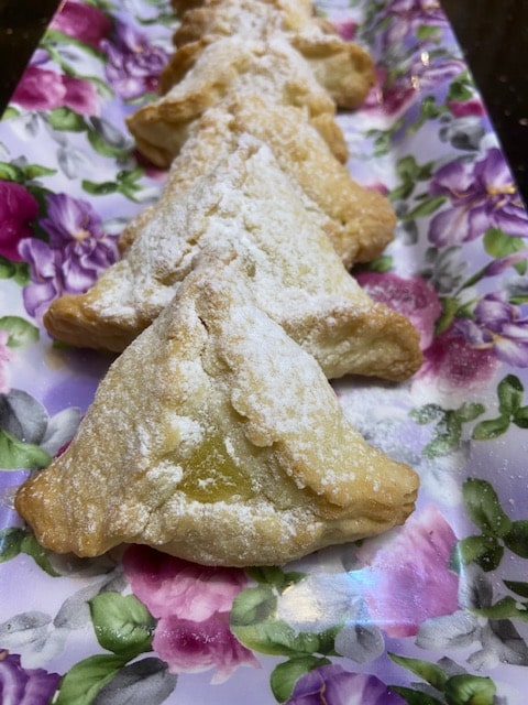 Let me start by saying that hamantaschen are a hotly contested cookie in our home. It’s about the filling. I could eat the poppy seed filled ones all day but DH is much less of a fan. So I said, okay, date? The face wasn’t pretty. Chocolate? I won’t say he said ewww but hey, we are married more than 40 years. Not a happy camper. So for the first time in many months, my daughter Rach came over with her kids and we made the hamantaschen together as an activity. I squirreled away a smaller half (if you get me) of the dough for us. Not being a fool, I asked beforehand what the filling of choice was for them. Nutella she said. So be it. NOT for the hubby. (Hence hiding my dough). So while we made pizzas together and the hamantaschen, which were a huge hit, I said eureka! I will make for hubby and me lemon filling.