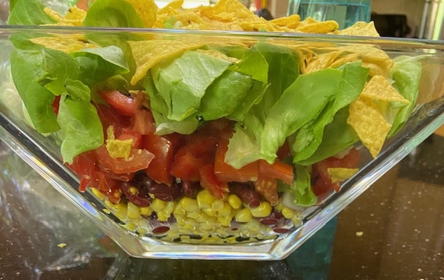 This is delicious, filling and easy to put together as well as pretty to look at. I serve this layered and only toss it seconds before serving it so that the salad stays crispy and the tortilla chip/corn chip topping doesn’t sog.
