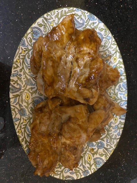 Now you see above that I have some sauce in a small bowl with a brush for brushing the chicken thighs. So as not to contaminate the teriyaki sauce, I pour some into the bowl, you can always add more sauce to the bowl. So brush the tops of the chicken with the sauce, turn over and brush again. Let sit till you preheat the oven to 400 F/205 C and since it takes 15-20 minutes approximately to come to temp, your chicken gets to marinate a bit. All good.