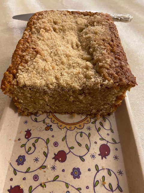 What it turns out to be is not quite a honey cake and not quite an apple cake but gives you an almost caramelized deep flavor that even those who aren’t fans of apple cake or honey cake will embrace. I tested this out on my neighbors Lisa and Murray and on my grandson Noam and of course, DH and my mama. It was a hit. As is often the case with a honey cake, the next day the taste was deeper and richer. I bake this in two loaf pans and yes, they freeze well, so you can have one for Rosh Hashana and another for before the fast of Yom Kippur or for breaking the fast on something sweet. Or ya know, for whenever.
