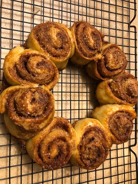 The problem with making these at home is to make them in a way that they don’t dry out. This has occupied an inordinate amount of my time since both DH and I (and the Mama as well) are all cinnamon people. I have plied these poor people with untold numbers of versions of the cinnamon roll, cobbling ideas from different places and I really believe I have found my ultimate recipe. It’s not difficult to make but it is yeast based so ya gotta give it the time and love. And guess what? It does NOT dry out. I did a reckless experiment and after baking it (at least one ring’s worth) I left it in a ziploc bag (air squeezed out) for 3, count ’em days. We ate some each day (my poor hubby kept saying, can’t I finish it off yet? and I wouldn’t let him, we must suffer for science) and it was delish for all 3 days. By day 4 (I know, I know, that was pushing it) it was kinda dryish but we ate it anyway. So I give you forthwith my cinnamon roll recipe and hope you will enjoy it as much as we did!