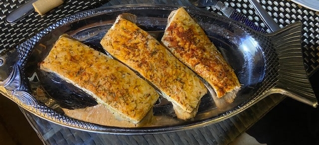 As I’ve mentioned in the past, fish is my fave fast food, it cooks quickly and basically, as soon as my company walks in the door, just plunk in the oven and 12-15 minutes later you have a roasted crispy, perfectly cooked piece of fish.