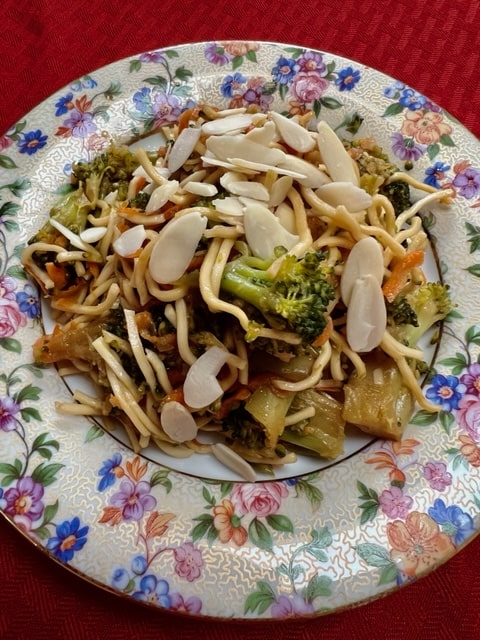 Upon our return, I wanted to do some cooking since I was doing very light cooking in Florida and actually missed being in the kitchen. I wanted to make a different kinda salad, but with a little heft to it, so I incorporated noodles into it. A little aside here. This is meant to be cooked with ramen noodles that absorb the dressing and “self cook” if you get me and that’s what I recommend in the recipe. However, all I had in the house (in quarantine for 7 days) was curly noodles that actually require a bit more cooking. So, I tried the ramen route, i.e. letting it soak up the liquids but they were still a bit too tough. So I just put the whole bowl in the microwave for 3 and 1/2 minutes and Bob’s your uncle! Done and it was perfect. This way if you wish to make the recipe and find yourself stuck like me, that’s one option or simply pre-cook some noodles. Onward.