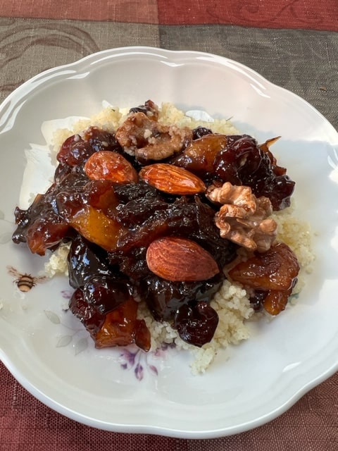 Now all you have to do is prepare your couscous – the recipe is on the blog here: Fluffy Couscous and as soon as it’s fluffed and ready, either plate individually, or mound the couscous on a dish and spoon the dried fruit tanzine on top topping the lot with the toasted nuts. It looks beautiful and tastes out of this world, perfect for celebrating your New Year of fruits!