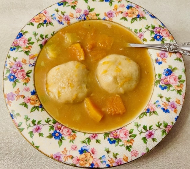 The pumpkin can take awhile to cook so bring to the boil and reduce heat to a low burble and cover with lid on a slant. Peek at it from time to time to make sure it’s not boiling, should be a low simmer. While it cooks, prepare the semolina dumplings. The dumpling dough should rest for about 15 minutes so take that into account.