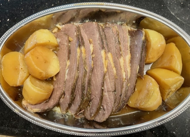 Place brisket in roasting pan with lid (or you will use tin foil to cover in 2 layers). Slather the honey on the top of the meat and pour bourbon on top. Take chopped garlic and ginger and sprinkle on top of that. Around the sides of the meat (not on top, we don’t want to wash away the garlic and ginger) pour the orange juice and soy sauce. Tuck the potatoes all around the meat, not underneath since the meat should sit in the liquid. Cover pan tightly with lid or aluminum foil and place in oven. Time for one hour and lower temperature to 325 F/160 C. Continue cooking in oven for another hour and a half. Remove and test with wooden skewer. It will most likely need an additional half an hour. Sweep garlic and ginger into the liquid in the pan, cover back up and continue cooking for half an hour. Let rest at least 20 minutes before slicing. Freezes beautifully and reheats beautifully.