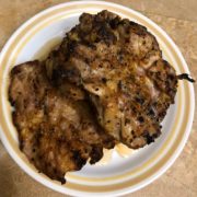 I’m always looking for a quick and delicious method of preparing chicken. I wanted something zesty and flavorful and I was really pleased with this combo of ingredients. I especially like this since it is delicious hot out of the oven, rewarmed but best of all, you can cool it down, slice it in nice slices for a wonderful grilled chicken topped salad with the salad fixings of your choice, served cold. This also works well as a first course salad, just use half a chicken thigh and it’s just right. You are whisking together a simple marinade for them to sit in and then grilling the skinless, boneless thighs for a total of approximately 14 minutes. What could be bad?