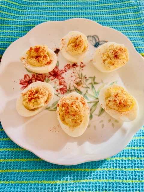 I hadn’t had a deviled egg in a while but this revved me up and I immediately made some. I must say that this recipe is an oldie but a goodie. It also is a lovely starter to a meal, and particularly good since they are halved, of course, and you pop them into your mouth. They also make a great snack and I’ve eaten them literally for breakfast, brunch or dinner as well. So although it’s very easy to prepare, you must hard boil your eggs to start.