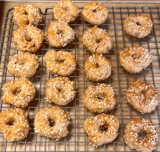 Form balls the size of walnuts in the shell (there will be approximately 43 rings) and place balls on the parchment lined sheets, spaced about one inch apart. Punch a hole through the middle of each ball in the center with your finger to form a ring. Brush the top of each ring with the beaten egg. Sprinkle sesame seeds on top. Bake the rings for 35-40 minutes or till nicely browned and crisp through and through. Cool on wire racks. Store in tins. Lasts about 2 weeks.