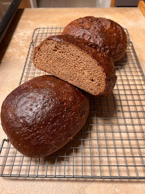 I’ve mentioned previously that DH and I prefer my homemade bread to the store bought and I like to play around with different types. I’ve wanted to make a good pumpernickel for some time now, just needed to get the rye flour and whole wheat (wound up with whole spelt instead, also good) to make it. Now this has the texture and flavor of a good pumpernickel but I eschew the caraway seeds, neither of us care for it, although you can add it if you choose.