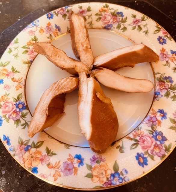 No splashing! Easy does it. Okay, now place the lid on the pot of chicken and let simmer on low for the amount of time described above, depending on the thickness of your chicken breasts. Btw, if you want to use large, thick chicken breasts, you certainly can, adjust the cooking time to about 20-25 minutes. Now take a piece out and slice to check if fully cooked through. If so, remove from heat, uncover and either let cool in liquid and refrigerate in liquid till chilled OR serve hot over cooked rice Simple Basic White Rice. The rice, btw, is easy to cook at the same time as the chicken. It’s about 18 minutes for the rice, so it times well together. If serving chilled, this is lovely over shredded lettuce and some cherry tomatoes. A note, the cooking liquid can be reused to cook this type of chicken. Store it in the freezer till ready to reuse and top up with a bit more soy sauce and spices.