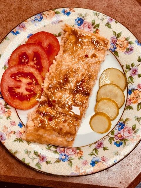 Now turn your oven on to 400 F/200 C. I know I usually have you preheat your oven first but I deliberately am having you do it after the slathering so that your salmon will have time to marinate a bit in the sauces. Wait patiently till the oven is hot and place salmon fillet in and time for 18-20 minutes or till lovely and browned and cooked just right. A note. I loathe salmon that’s uncooked in the middle or rare (I eat sushi, it’s a different thing) so time it according to your preference. You like it rarer go for 15 minutes. That’s all folks! Serve plated or on a tray – lovely with fresh salad and boiled new potatoes with butter and salt. They’ll lick their fingers and ask for more.