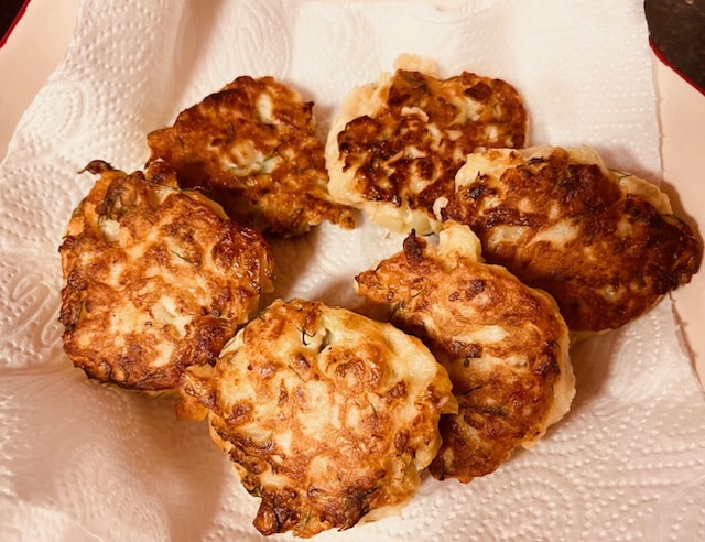 Bring water to boil with 2 teaspoons of salt and boil florets for 8 minutes exactly. Drain well. The cauliflower will still have some crunch to it and that’s correct. Chop the cauliflower coarsely and set aside. Peel the potatoes and cube and cook in salted water till fully soft. Mash potatoes well (it doesn’t have to be perfectly smooth, however). In a large bowl, place the flour, eggs, fresh chopped dill, add the mashed potatoes and chopped cauliflower, the salt and pepper and mix thoroughly. Batter will be chunky. Form patties and take a frying pan with oil to cover the bottom of the pan (add more as needed, just bring temperature back to frying heat) and heat oil to medium heat, frying fritters about 4 minutes on each side till deep golden brown. Drain and serve. Lovely with sour cream or maybe some horseradish, red or white for a change of pace.